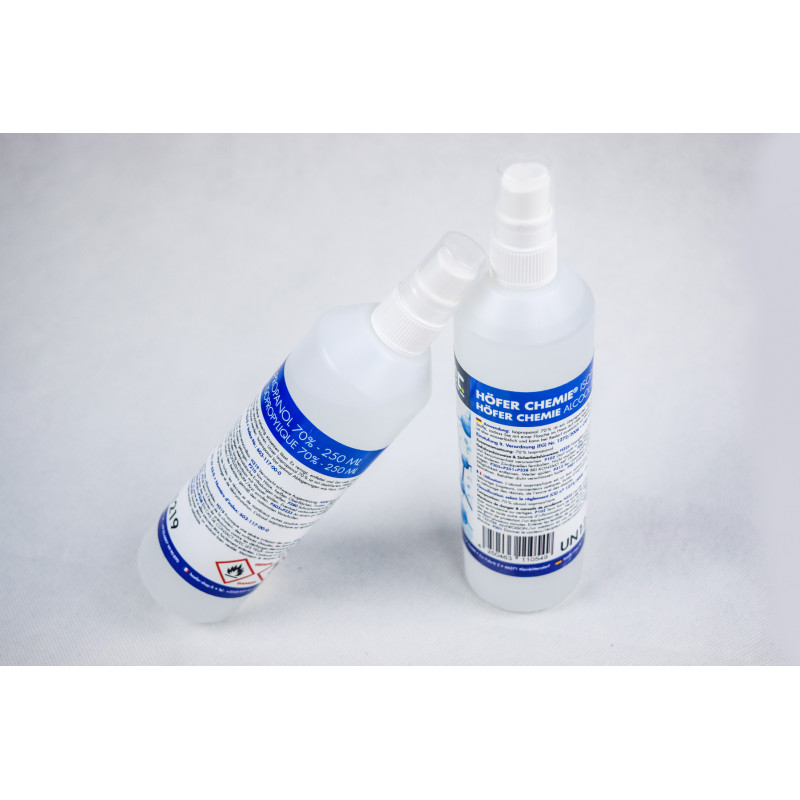 A 250mL bottle of isopropyl alcohol 70° to clean and disinfect Eye Breed suction cups